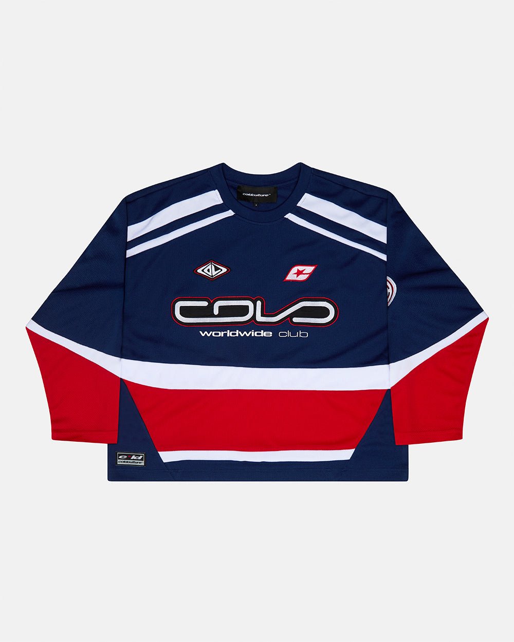 Blue color with red and white details.