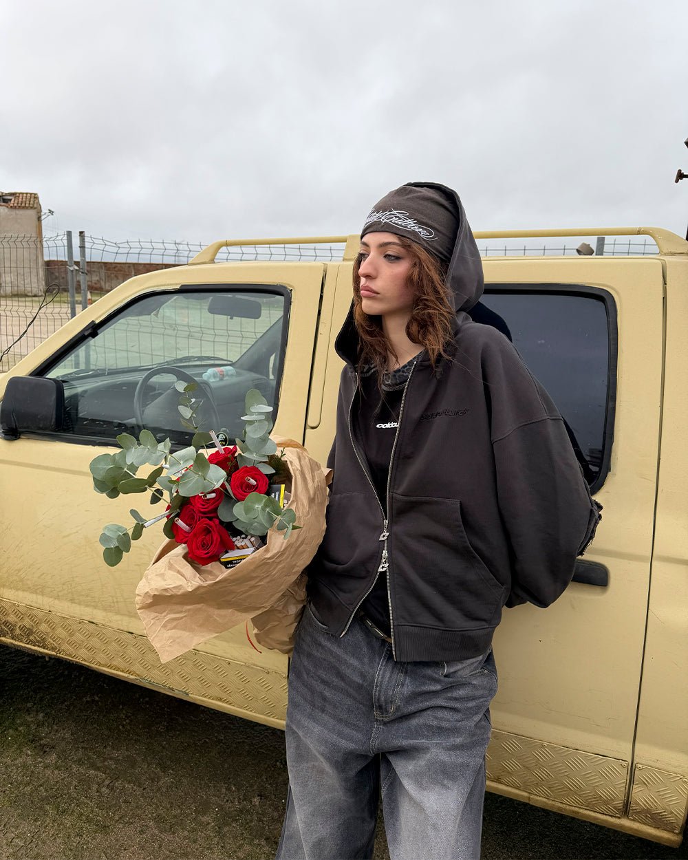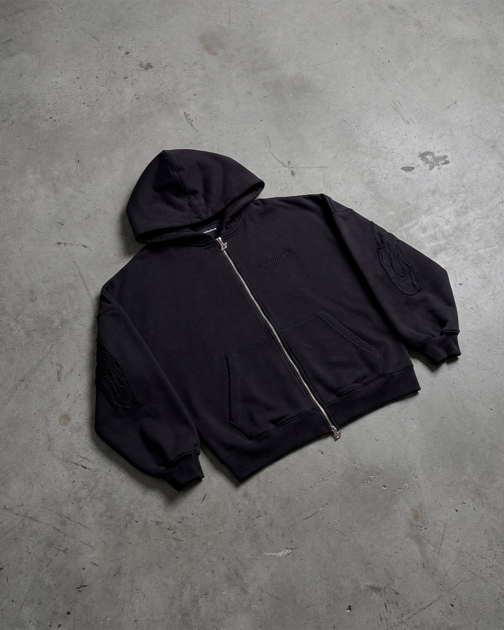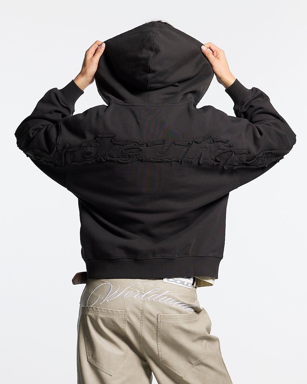 DISTRESS CURVED ZIP HOODIE DARK GREY