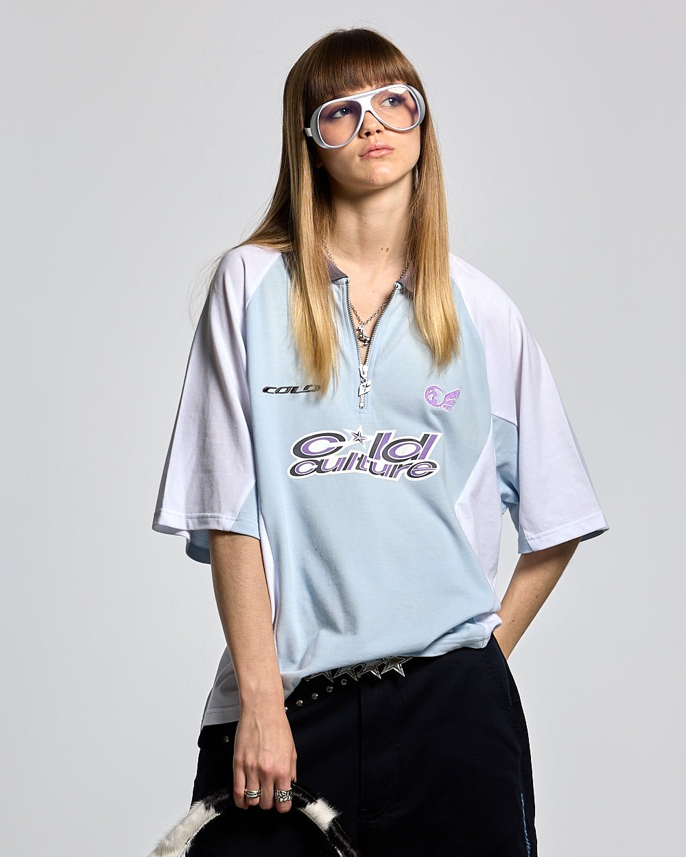 Half-zip closure with metal zip.