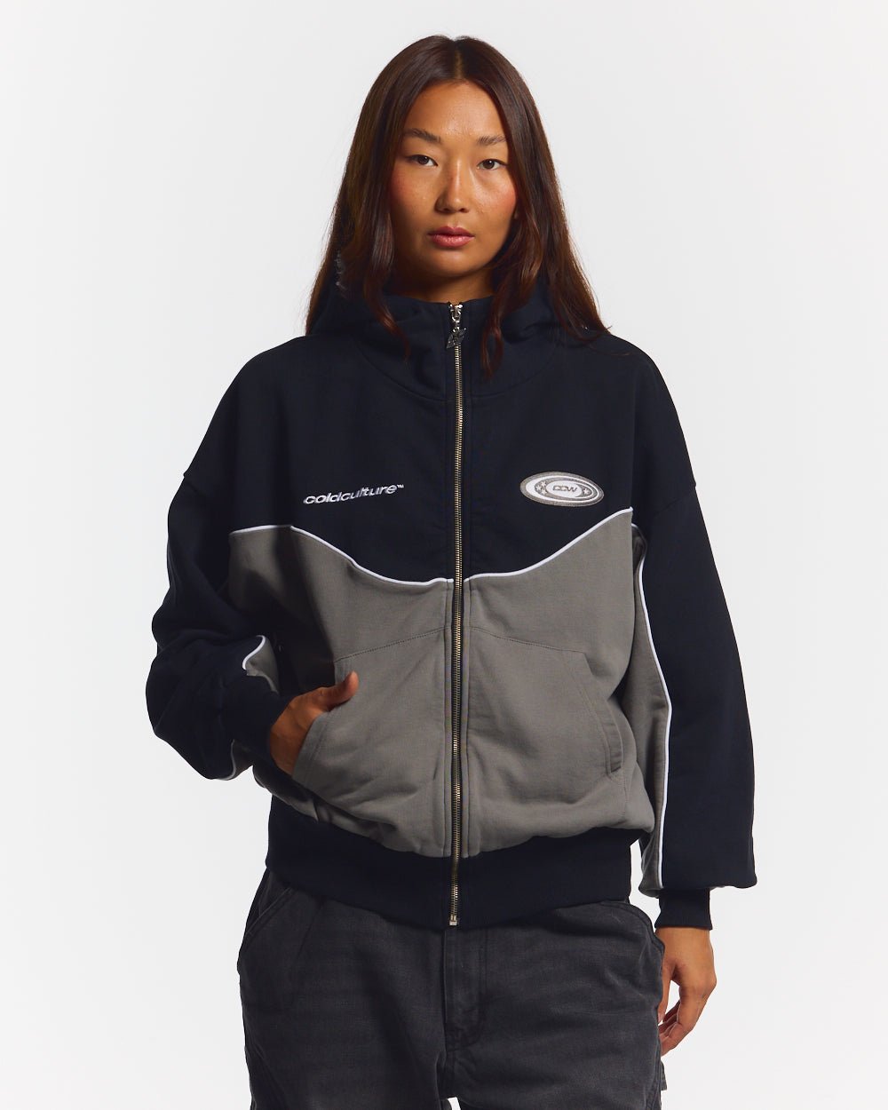Boxy fit zip hoodie with diver style hood.