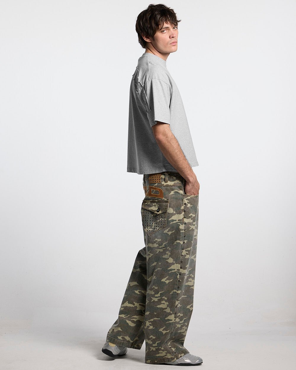 Camo with metal studs alongside seams.