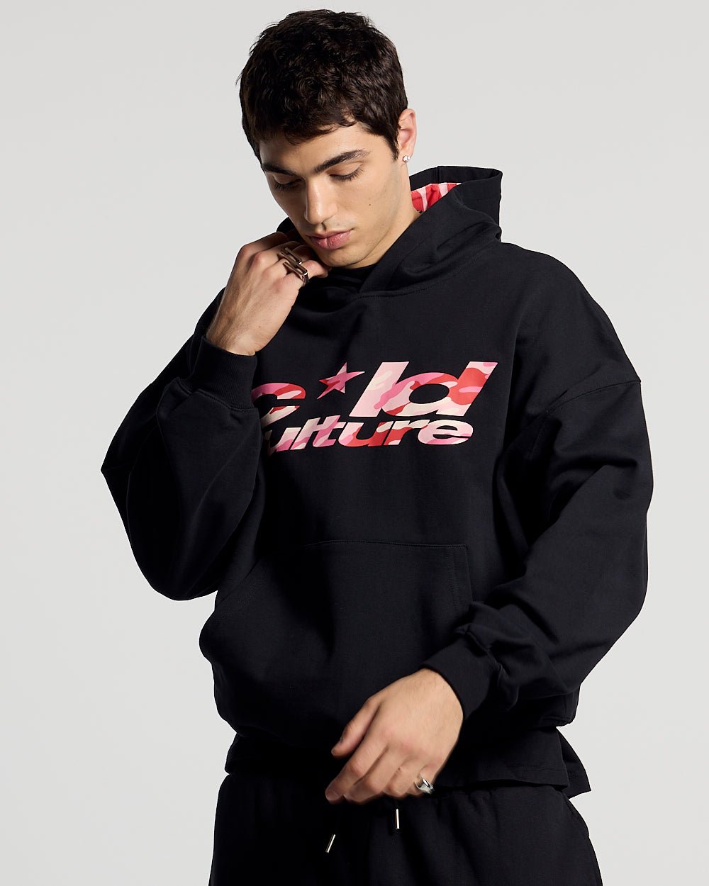 Pink camo logo screen printed on the front and pink camo print inside the hood.