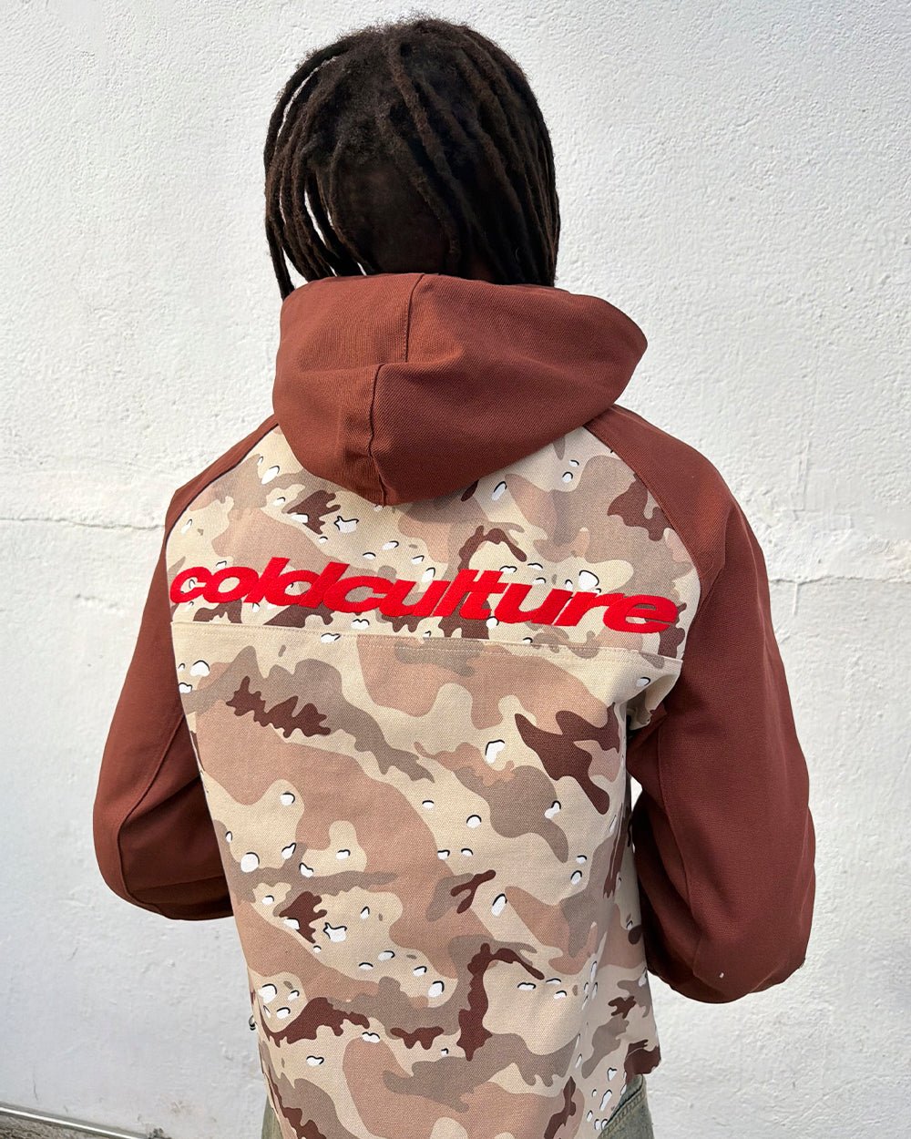 Cuerpo con estampado de camuflaje y capucha y mangas de color marrón liso.
