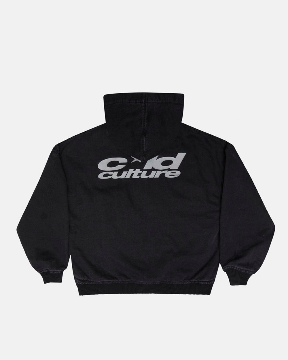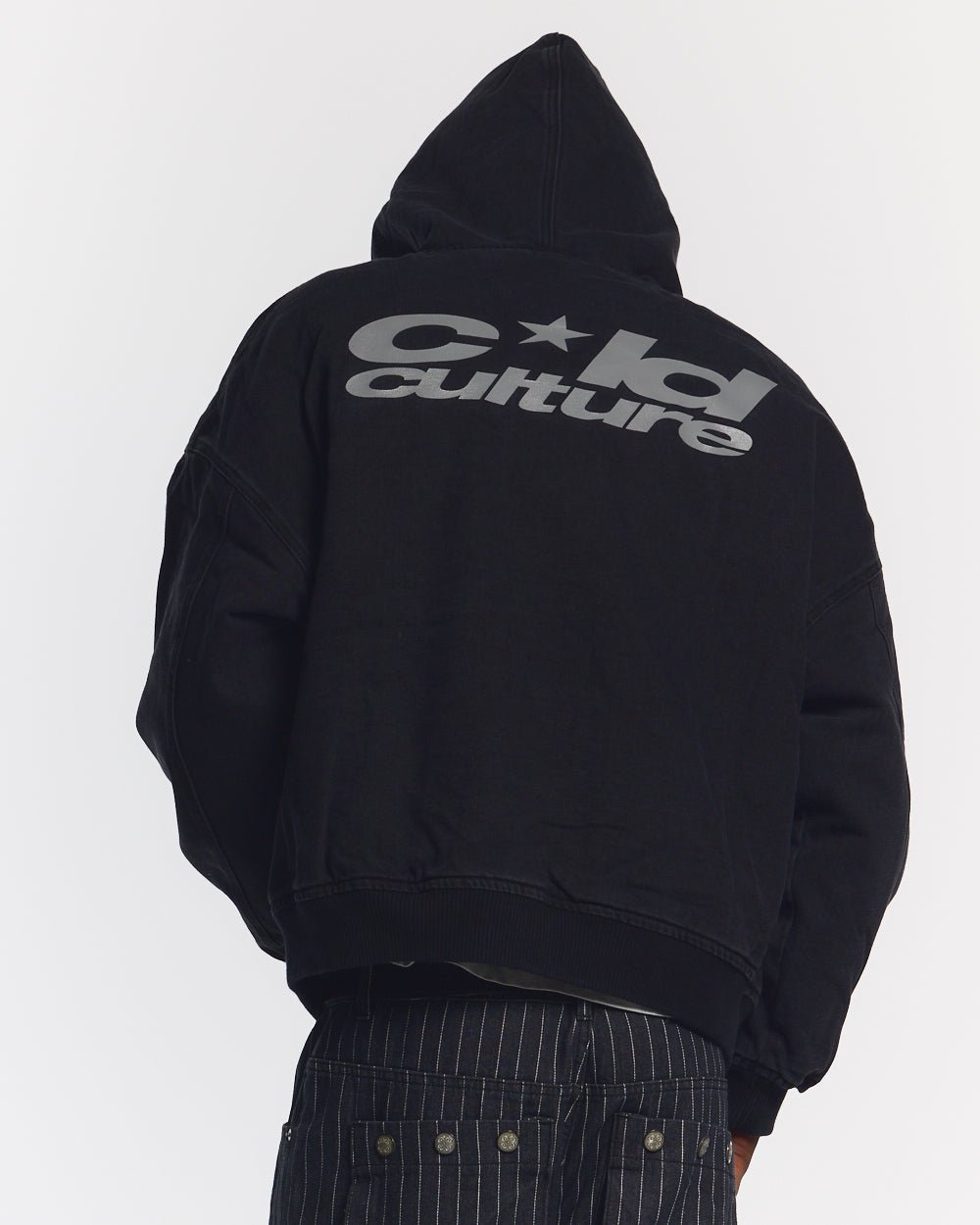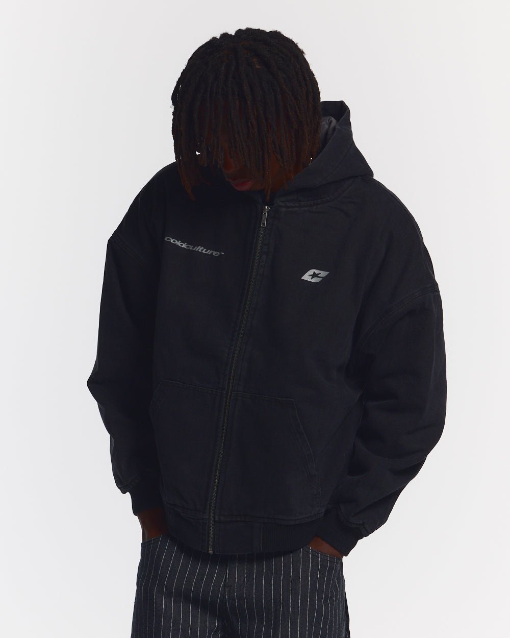 Chaqueta con capucha de corte holgado y estructura cuadrada.