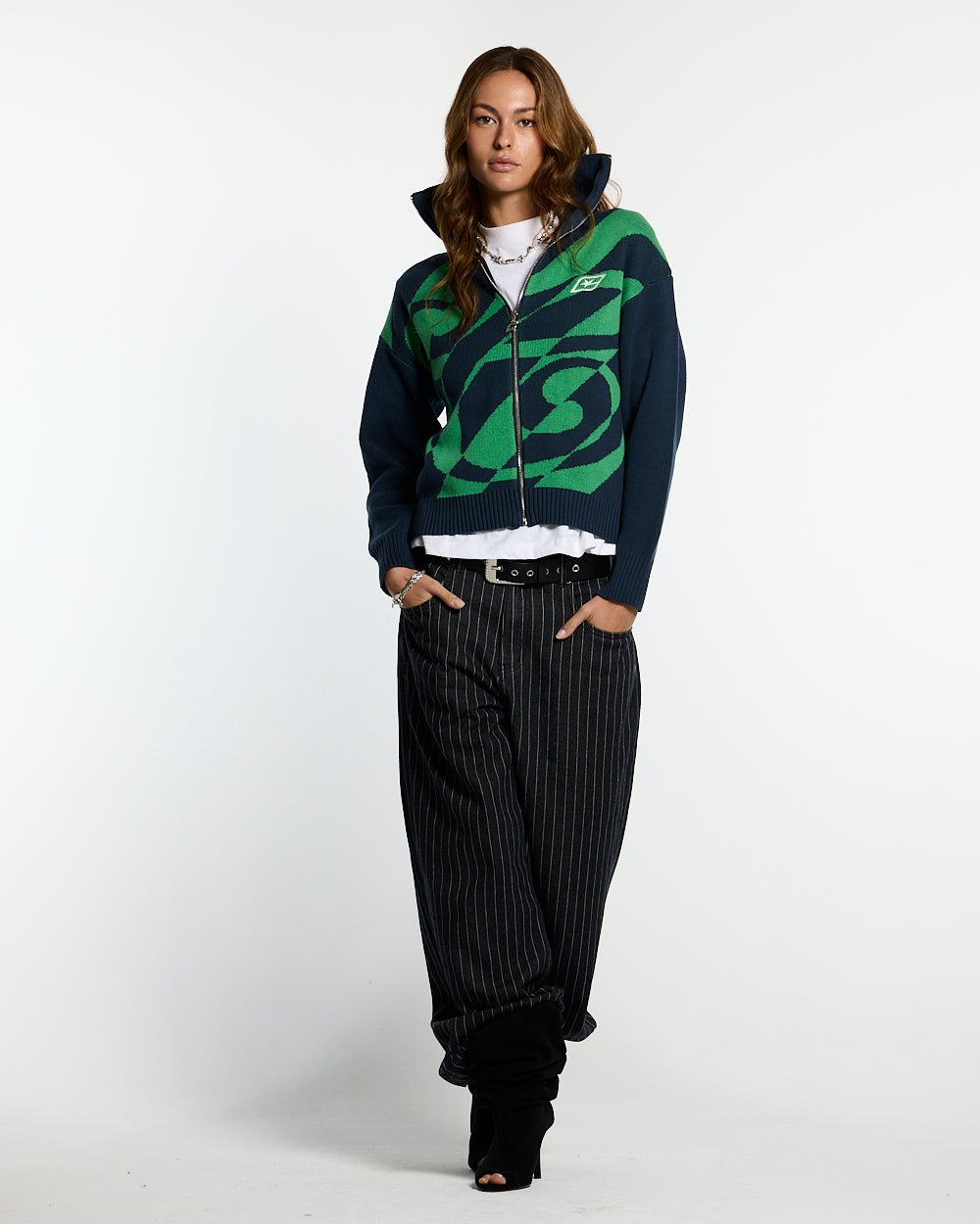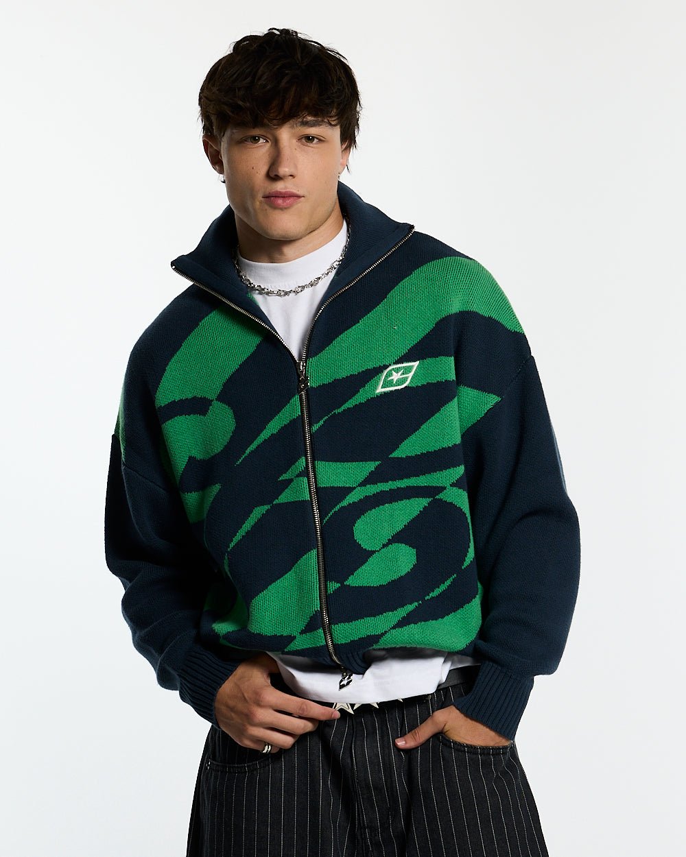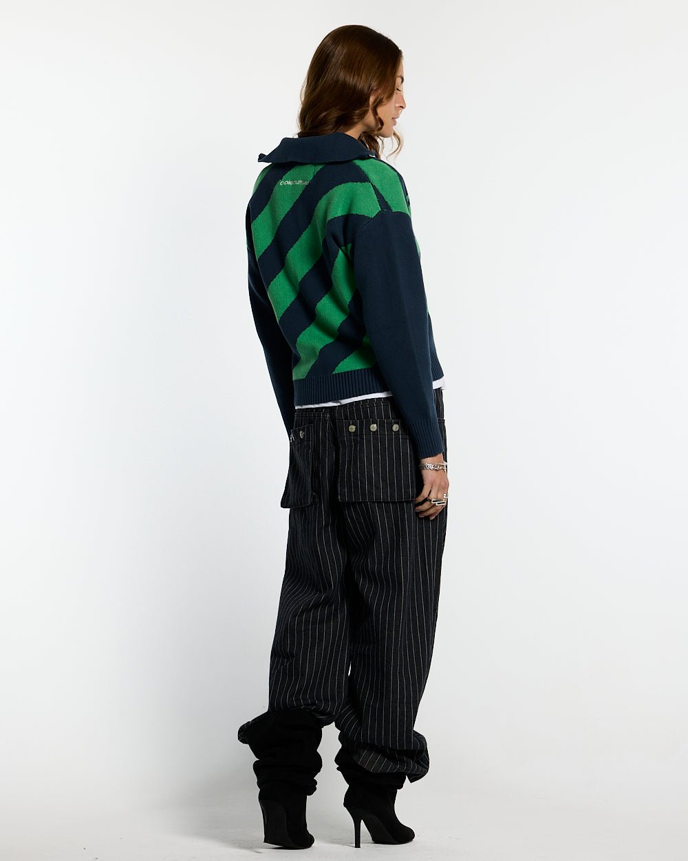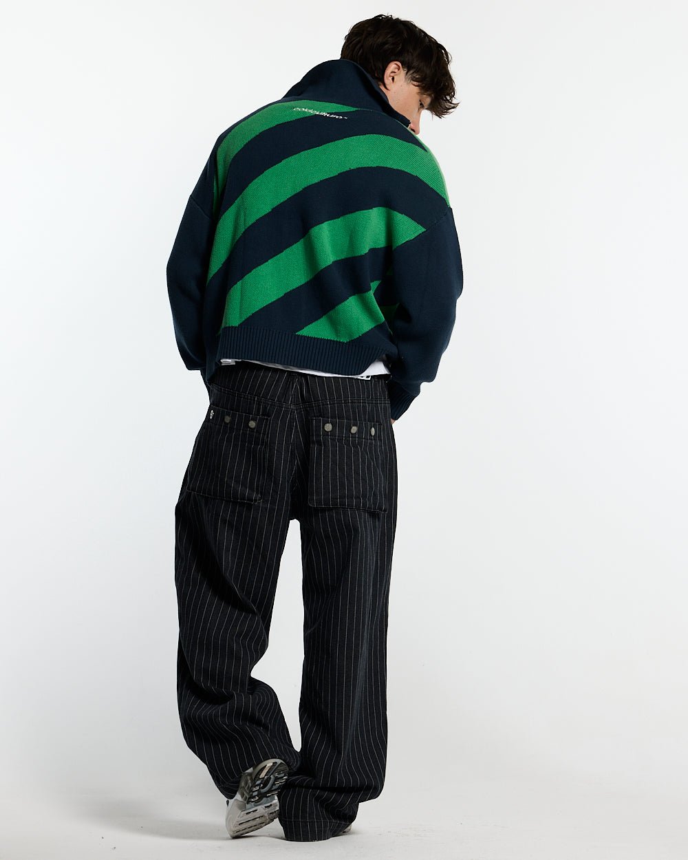 Rayas diagonales verdes y azules en el cuerpo.